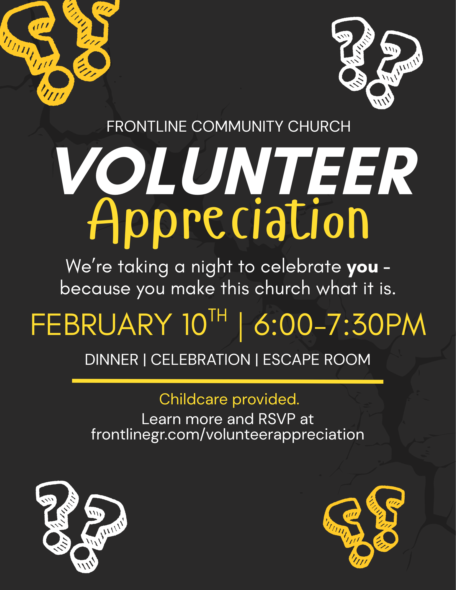 You're invited to our Volunteer Appreciation dinner on February 10th, from 6:00-7:30pm! This evening is all about thanking volunteers like YOU who make our church what it is.